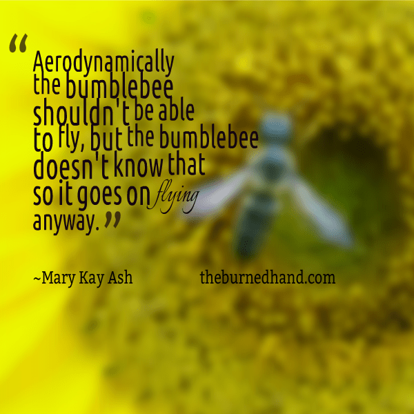 I was at a loss as to what I would tell you today that would be different from other days. Maybe you are going through some hard times and you just don’t feel like you can get a break. It’s one thing after another. Ever have one of those days, weeks, or months? I can relate. So I started thinking about quotes I like. Things that inspire me. I remembered a video I once watched on a bumblebee. Then I remembered the purpose of the video. The purpose can be summed up in one quote:
